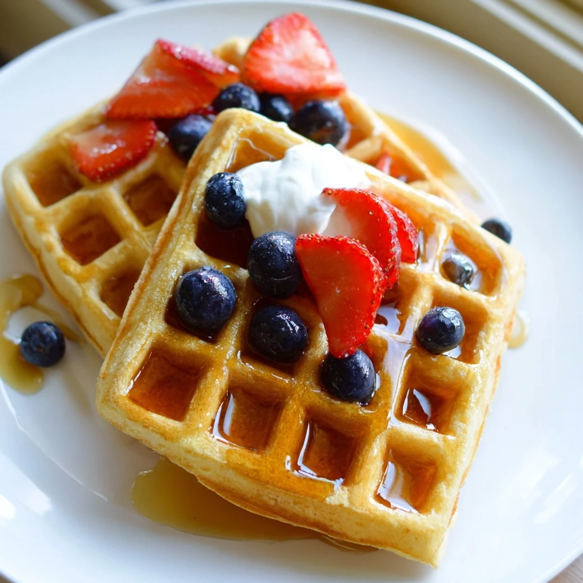 Beyond the classic syrup combo, try spreading warm waffles with peanut butter and banana slices or topping with a dollop of additional Greek yogurt and honey. The tart yogurt cuts through sweet toppings perfectly.