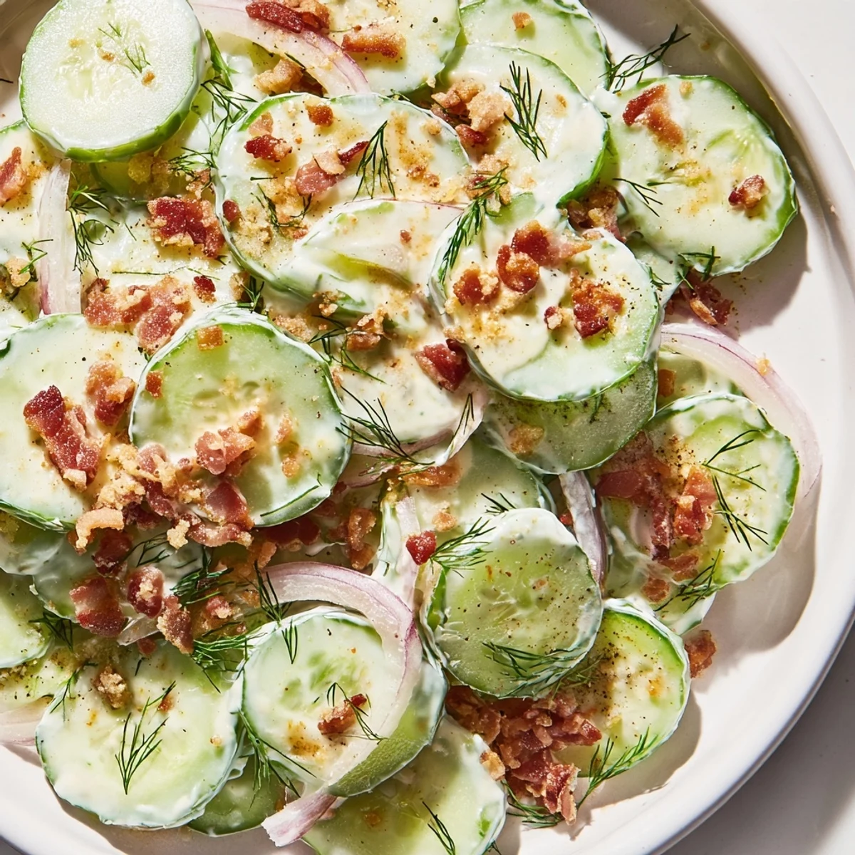 This crisp, refreshing salad combines juicy cucumbers and smoky bacon in a light, tangy Greek yogurt dressing. Ready in just 25 minutes, it makes an ideal healthy lunch or side dish. The creamy dressing with apple cider vinegar and Dijon mustard perfectly complements the fresh vegetables and crispy bacon bits.