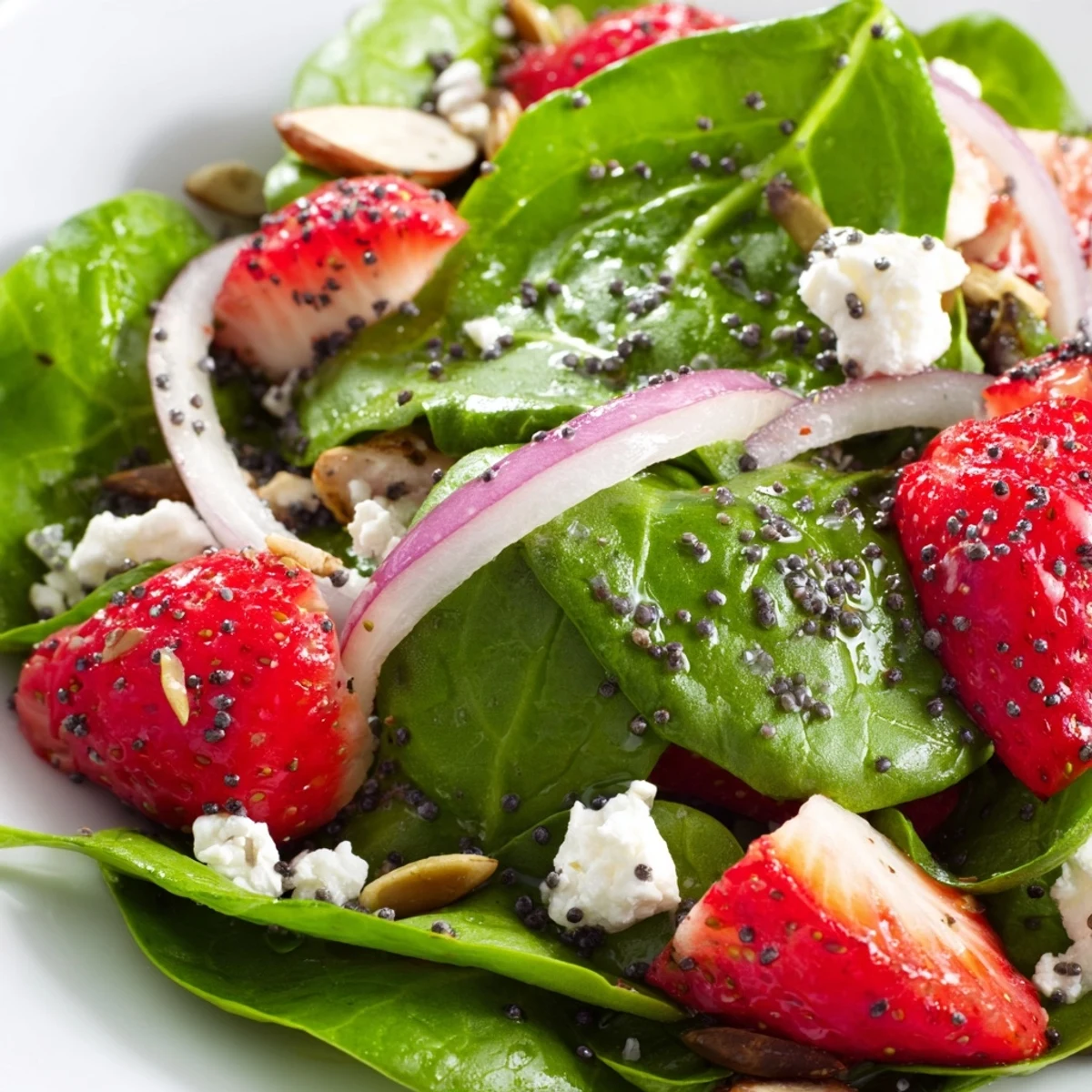 This vibrant bowl brings together tender baby spinach, juicy sliced strawberries, and crisp red onion for a colorful base. Toasted almonds and sunflower seeds add satisfying crunch, while crumbled feta brings creamy richness. The star of the show is a homemade balsamic poppy seed dressing—whisked from vinegar, honey, Dijon mustard, and olive oil—that perfectly balances sweet and tangy notes.