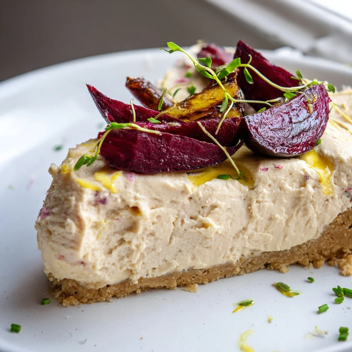 - Release the cheesecake from its pan, arrange roasted beetroot wedges on top, scatter with fresh chives and microgreens, then finish with a generous drizzle of your best olive oil.