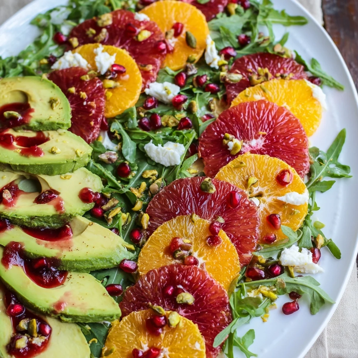 This vibrant salad combines juicy navel oranges, ruby grapefruit, and blood oranges layered over peppery arugula or mixed greens. Creamy avocado slices and crunchy toasted pistachios add texture, while a tangy pomegranate vinaigrette ties the flavors together. Optional feta cheese adds a subtle creaminess. Perfect for a light and refreshing dish on cold days, it’s quick to prepare with fresh, seasonal ingredients.